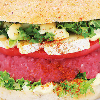 Pane di grano antico varietà San Pastore a lievitazione naturale alle Nocciole e Miele di Castagno farcito con Carne Cruda di razza Piemontese al sentore di agrumi, maionese al Metodo Classico Alta Langa, formaggio Montébore, pomodoro cuore di bue, indivia riccia, polvere di Peperone di Carmagnola e Timo fresco.